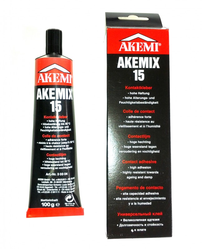 AKEMIX 15 – однокомпонентный универсальный клей на основе полихлоропрена. Склеивает камень, металл, дерево, войлок, сукно, фетр, слоистый пластик, полиуретан-эластомер, пенопласт, латекс, ковры, твердый и гибкий ПВХ, резину, бутилкаучук, синтетическую резину. Подходит для промышленного производства. Не пригоден для вспененного полистирола, полиэтилена.
